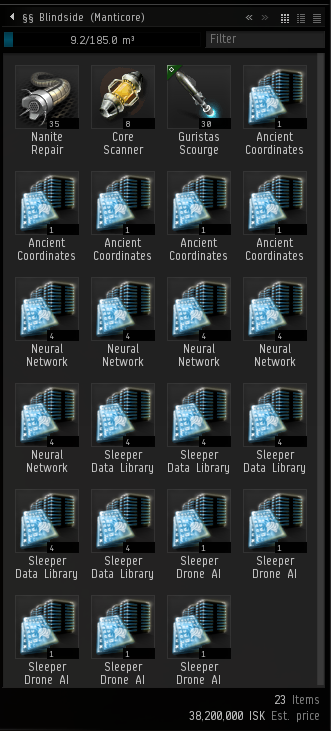 I am far enough out, so I make my perch. Now the fleet is done with this site, and they warp. Hmm, some nice loot out there. Come here, Noctis! But it doesn't. Instead it finishes its site -- no more wrecks with it on narrow dscan -- and it disappears. It may have warped off or it may have cloaked; I cannot tell that from just dscan. Where did it go? There are some anoms out of dscan range that I know about, and I want to check the outer planets for the Noctis. So, I warp around the system dscanning. The sites are intact. No Noctis anywhere. I see a Manticore at an outer planet, but it's Hiljah's. Accidental decloak. Careful!